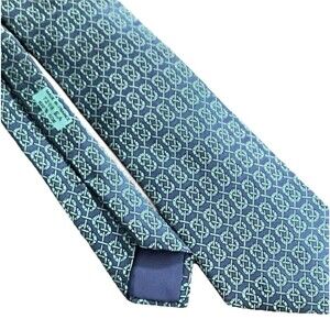 This classic Hermès Paris 100% silk tie features an equestrian-inspired horseshoe and polo mallet motif in deep navy and vibrant teal. It is in excellent pre-owned condition.