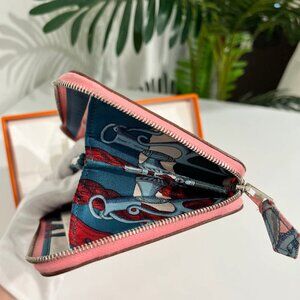 Authentic Hermés Silk'In Classique long zip around wallet in pink. Features a pink silk multicolored print lining. This piece in in ggreat condition, with one minor mark as pictured. Comes with the original box and care card. Measures 4.25" H x 8" L x .75" D.