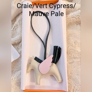 Hermès Rodeo Pegase Charm size PM in colors: Craie, Vert Cypress, and Mauve Pale