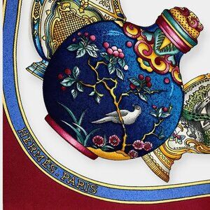 This exquisite Hermès carré features an ornate design celebrating the artistry of vintage perfume bottles. Titled "Qu'importe le Flacon..." ("What matters the bottle..."), the scarf displays a mesmerizing arrangement of intricately illustrated flacons, framed by a regal crimson border. The center radiates with decorative glass bottles rendered in vivid jewel tones and baroque details.
