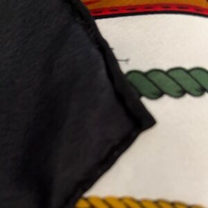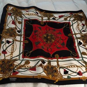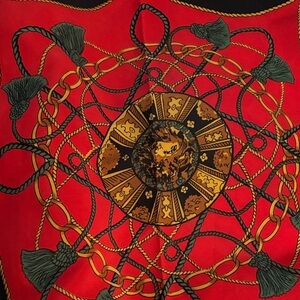 Hermès Silk Scarf with Red, Gold, and Black Design . Hand rolled edges-