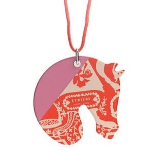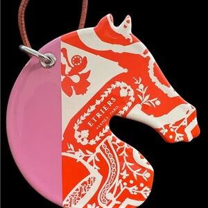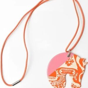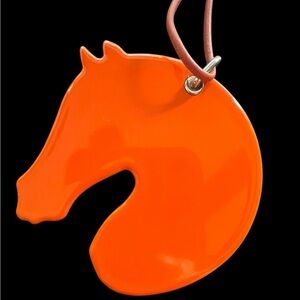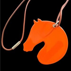 Vibrant rare Hermès Tatersale horse head pendant in orange and pink with a leather necklace. Reversible pendant for two different looks. Unique and stylish accessory. In pristine condition large pendant 1.3 in x 1.4 in