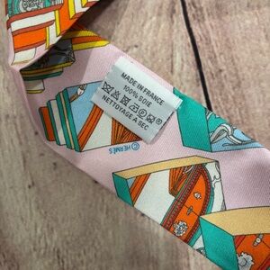 Hermès Twilly silk scarf in a vibrant pink multicolor horse carriage and geometric print. Classic slim Twilly style, perfect for wrapping on a handbag handle, styling in hair, or wearing on the wrist or neck.