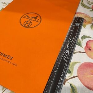 Striking Hermès bag in bright orange. Features classic logo and sturdy brown handles.