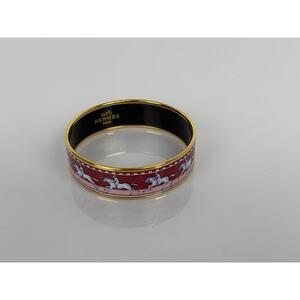 This Hermès enamel bangle features a burgundy and pink design with a detailed white horse and horseman illustration. Golden lines frame the artwork beautifully, while the inner part is finished in black. Made in Austria, the bracelet is in gently used condition. It retains a vibrant appearance with only minimal signs of wear.