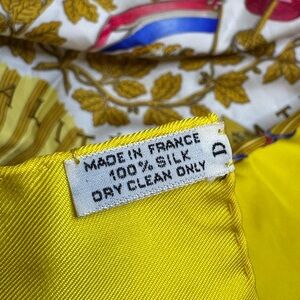 Vibrant Hermès silk scarf featuring a striking yellow background with intricate multicolor designs. Perfect for adding a touch of luxury to any outfit.