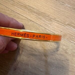 Stylish Hermès bangle in vibrant orange with gold accents. Perfect for adding a pop of color.