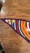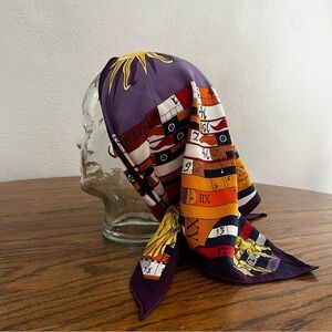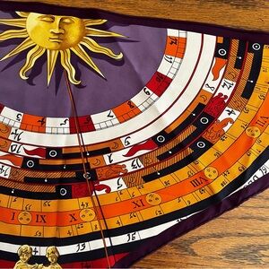 Vibrant silk scarf featuring zodiac designs. Rich colors with sun and celestial motifs.