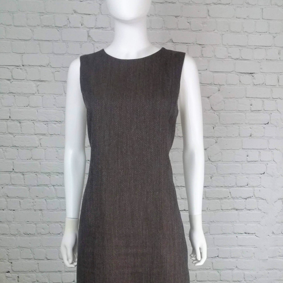 This is a sleeveless shift dress that is a cool brown with a fine herringbone design. It is in great condition, no defects or problems. Great basic work dress or base for building an outfit. Tag says "Platinum: by Larry Levine."