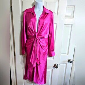 Hers & Mine Hot Pink Satin Tie Front Button Midi Dress Women’s Large Glam Luxe
