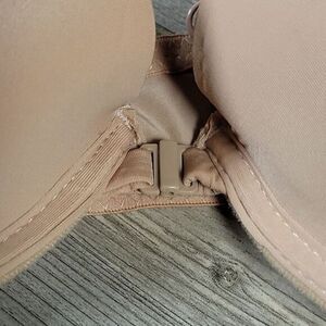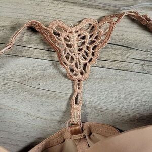 This tan bra is padded with front closure and ornate racerback straps. Content: nylon, spandex. Care: hand wash, line dry.