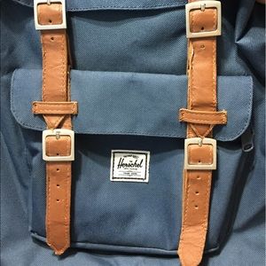 Little America Backpack by Herschel Supply Company. Navy with tan synthetic leather straps. In good condition with minor wear to the leather straps pictured above.