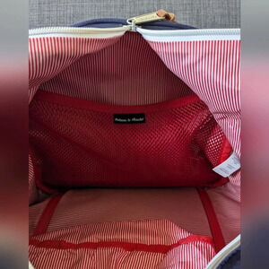 Men’s ‘Offset Novel’ navy and white striped duffle bag with side zip shoe compartment and leather details from Herschel Supply Co. Adjustable padded shoulder strap and premium vegetable tanned leather handles. Outer material crafted from a synthetic fabric with screen printed stripe details. Two-way waterproof zip with vegetable tanned leather pull opens to reveal Herschel heritage striped fabric lining in red. Spacious 42.5L capacity including an internal mesh pocket. Classic woven Herschel label featured on the front and on the detachable strap.
