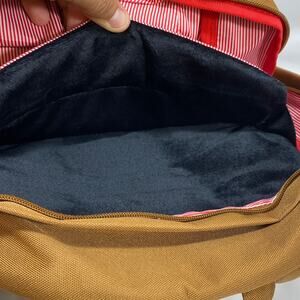 Introducing a Herschel Supply Co Pop Quiz Backpack in brown with black camo accents and red lining. Features a 15" laptop pocket, multiple compartments for organized storage, and a 22-liter capacity for everyday use. Designed with padded shoulder straps and durable materials for comfort and longevity. This backpack is brand new and unworn.