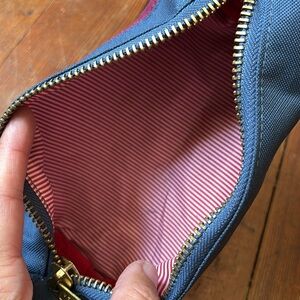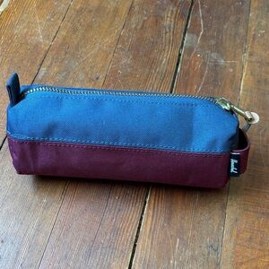 'Settlement' case in burgundy pencil case design from Herschel Supply Co. Crafted from synthetic material. Features convenient carrying handle on the side. Brass zipper with synthetic pebbled leather zipper pull in tan opens to reveal signature Herschel striped fabric liner in red. Interior has a 0.9 litre capacity. Woven brand tab on the back. Classic woven brand label featured on the front.