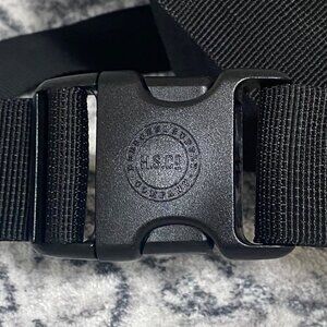 Herschel Supply Co Light Weight Fanny Bum Bag in Black, wide adjustable strap with clip, gold zipper closure, red and white stripe fabric lining