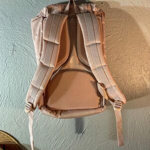 This is a stylish and functional Herschel Supply Co. Little America backpack in a lovely light pink/blush color. The bag features a subtle polka dot print for a playful touch. Known for their classic mountaineering-inspired design, this backpack includes signature details like the adjustable faux leather straps with magnetic pin clips, a drawstring closure, and the iconic woven Herschel label. The bag is in great pre-owned condition, with some minor signs of wear and a few faint smudges, as shown in the photos. The interior is clean, and the bag is perfect for school, commuting, or casual daily use.