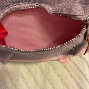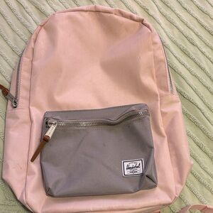 Stylish Herschel Supply Company backpack in pink and gray. Features a front zip pocket. Main zippered compartment. Measurements are 14” wide x 16” tall.
