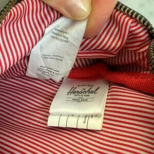 Classic Herschel Supply Co. navy blue canvas belt bag/hip pack with signature red-and-white striped lining and front woven logo patch. Features durable poly shell, brass-tone zipper closure, and adjustable strap that extends up to 46”. Perfect for daily errands, travel, concerts, or minimalist streetwear looks.