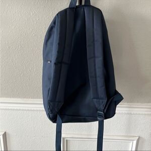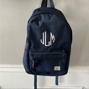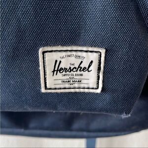 This Herschel Supply Company backpack features a deep navy blue color and is made from a durable textured fabric. It includes two comfortable shoulder straps and a prominent white logo on the front, making it a stylish choice for everyday use.