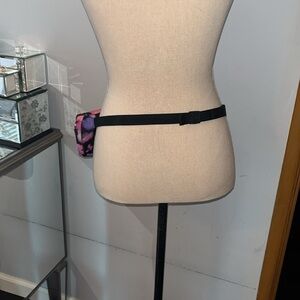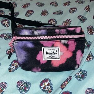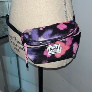 Herschel Twelve hip pack featuring a blurry floral/black crosshatch design. The hip pack has a pink zipper and an adjustable black strap. The Herschel Supply Co. logo is displayed on a white label on the front of the bag. Herschel is a Canadian company founded in 2009 that specializes in manufacturing backpacks and accessories. The company targets the 18 to 35-year-old "travel consumer". The Twelve hip pack is designed for safely storing small valuables and can be worn around the waist or across the shoulders. The primary materials of the hip pack contain a minimum of 20% recycled content and it has an adjustable clip-fastened strap.