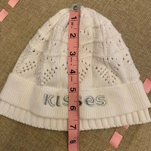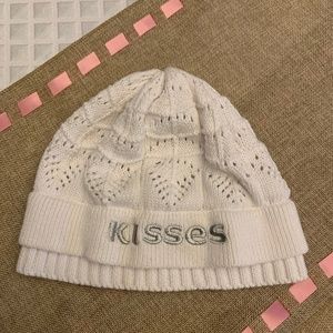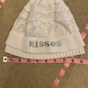 White hat with silver lettering. Unlined. Fun, lightweight hat for the cooler days of fall.
