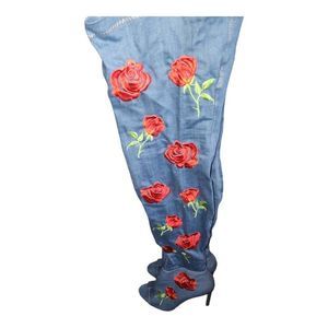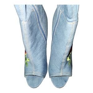 Herstyle Denim Stretch Thigh High Embroidered Roses Open Toe Stiletto Heel Size 9