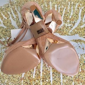 NWT Snakeskin-look nude leather and jewel platform sandals. 5". Sz 39.5/9.5. Floor sample w minimal wear from trying on. Mark on heel. Comes with beat up HL box.
