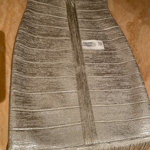 Brand new with tags. Shimmer into the evening in this beautiful bandage gown embellished with a metallic woodgrain print and eye-catching fringe.