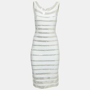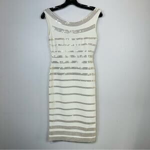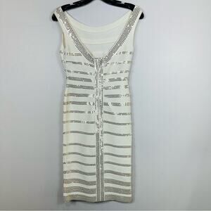 Herve Leger Fatima Gold Sequin Striped Bandage Dress White Alabaster Combo Size Small