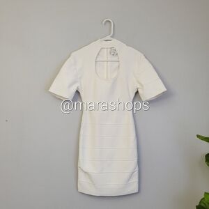 A bodycon T-shirt silhouette Icon dress, complete with a front cutout, mock neckline, and hem that hits above the knee. This garment is made using recycled yarns to help reduce waste.