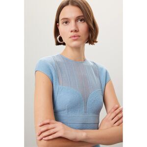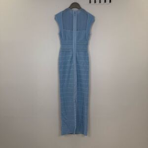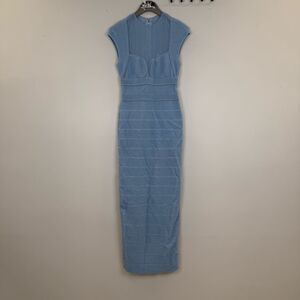 Elegant light blue dress by Herve Leger. Features cap sleeves and a fitted silhouette. Perfect for formal occasions.
