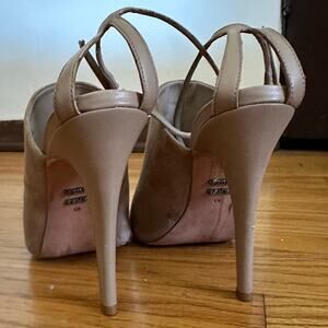 Gorgeous pair of shoes from Hervé Leger. These are crafted with supple suede that really hugs your foot, and a slight platform for added stability, and a strap that goes around your ankle for security. These are quite comfy for heels of this height, actually!