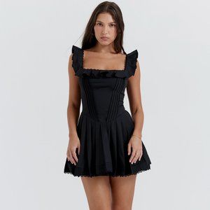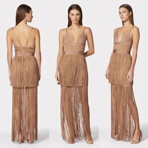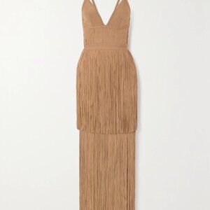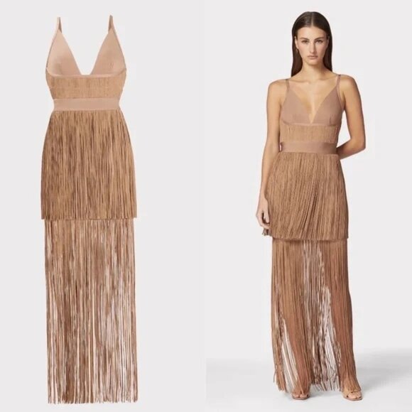 DESCRIPTION: A body-hugging, conversation-starter with signature fringe. This gown features a bandage base and a bustier-inspired neckline. This garment is made using eco-friendly recycled yarns to help reduce waste.