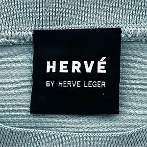 This chic mini dress by Herve Leger features a sleek sheath silhouette in a soft green hue. Designed with a crew neckline and raglan short sleeves, it offers a modern and sophisticated look perfect for casual or work settings. The structured fabric ensures a flattering fit that maintains its shape throughout the day.