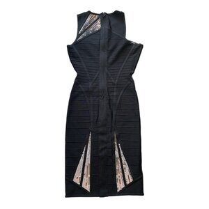 Elevate your evening look with this authentic Hervé Léger bandage dress in size XS. Crafted from a signature stretch bandage fabric, this sleek black bodycon design features striking geometric panels adorned with silver and rose-gold sequins for a sculpted, high-shine silhouette.