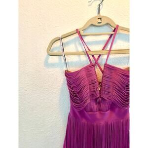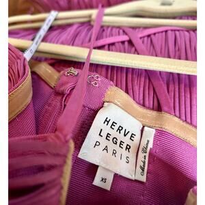 Stunning Hervé Léger bandage dress with dramatic pink tiered fringe and strappy back design. XS. Sculpting fit, excellent condition. Original retail $1650.