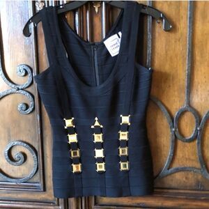 Elegant black top with striking gold accents. Sleeveless design. Perfect for a chic look.