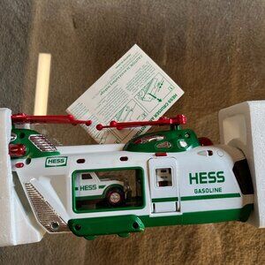 Add a classic collectible Hess set to your collection! This 2001 Hess helicopter comes brand new in its original box and includes a motorcycle and cruiser. Both vehicles feature friction motors with real head and tail lights, and the helicopter comes with working lights and sounds. The set also makes a perfect display piece for collectors or a fun gift for kids.
