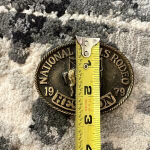 This is a vintage collector's belt buckle from the National Finals Rodeo, dated 1979. It is marked on the back as the "Fifth Edition Collector's Buckle," commemorating the 6th annual network telecast of the event. The front features a bareback rider on a horse, with "National Finals Rodeo 1979" and "Hesston" prominently displayed. The buckle has a brass/bronze-like finish with a roped border. It is a highly collectible item for rodeo and Western memorabilia enthusiasts.