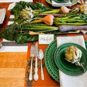 We have taken some of our favorite harvest vegetables and added them to a rich persimmon background to create our Harvest Vegetables Placemat. Layer with our Brown or Black Painted Check Runner to create a rustic tablescape.