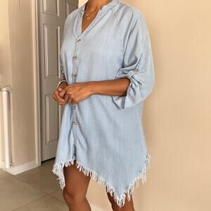 Hester & Orchard Chambray 3/4 Sleeve Button Down Blouse Asymmetrical Raw Hem