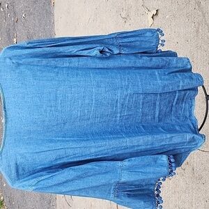 Hester & Orchard Vneck Pom Pom Bell Sleeve Blue Jean Sz. XL Tunic