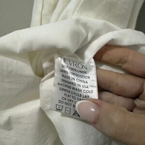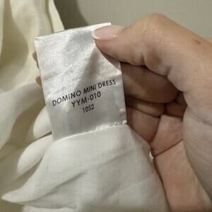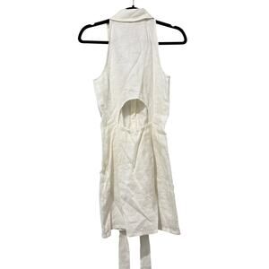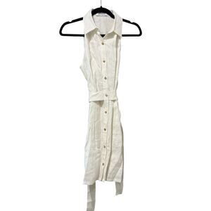 Hevron Domino Dress in White. Women's Size M / Medium. Features lightweight non-stretch linen weave, pleated waist, attached self belt at waist, cutout at back with elastic trim, collared neck, button placket, lined, sleeveless, and short mini length. 100% linen. New without tags. Retail $425.