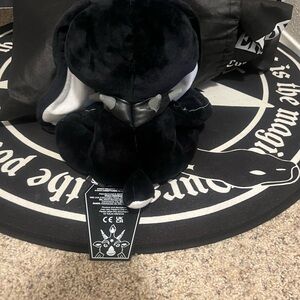 Charming plush bunny with unique stitched eyes. Soft black fur and contrasting white ears.