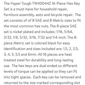 Must-have for household repair, furniture assembly, auto and bicycle repair. The set consists of of 8 SAE and 8 Metric sizes to fit the most common hex nuts. The 8-piece SAE set is nickel plated and includes: 1/16, 5/64, 3/32, 1/8, 5/32, 3/16, 7/32 and 1/4-inch. The 8-piece Metric set is colored black for easy identification and sizes included are: 1.5, 2, 2.5, 3, 4, 5, 5.5 and 6mm. All 16 pieces are heat treated steel for durability and long-lasting use. The hex keys are dual ended so different levels of torque can be applied so they can fit into tight spaces. Each key can be removed and returned to the size marked corresponding slot on the holder.
