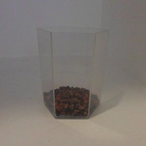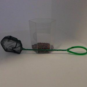 - Includes hexagonal shaped plastic aquarium (no lid), red gravel, & a small green net.