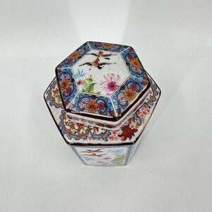 Hexagon Asian Handpainted Ceramic Ginger Tea Jar Mid Century Modern Birds MCM