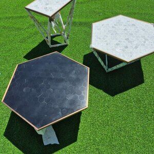 Hexagonal White Marble Tables – Set of 2 Elevate your space with this chic pair of hexagonal tables featuring sleek white marble tops and elegant golden steel bases. The geometric design adds a modern flair, while the metallic finish brings a touch of luxury. Perfect as side tables or accent pieces, this set of two is a stylish steal at $99.