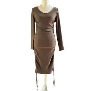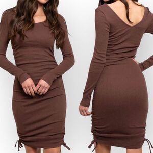 This dress features long sleeves and comfy ribbed material. The form fit and drawstring side details add the perfect finishing touch.